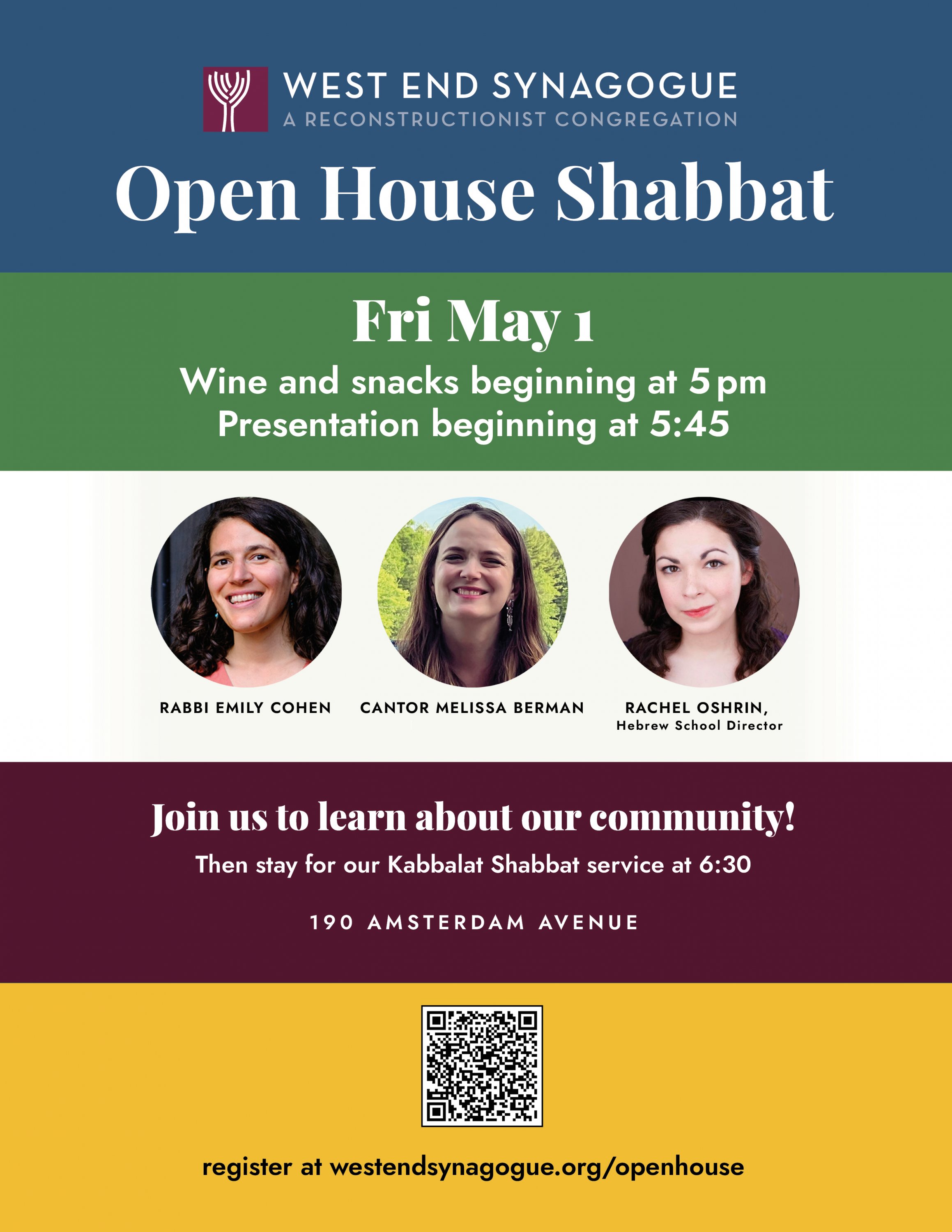 At West End, we are Jews and loved ones of Jews and non-Jewish seekers, young and old and in between, highly educated and just beginning to learn, happy to pray in a traditional manner and constantly seeking innovation, theists and atheists and agnostics, seekers of spiritual centeredness and of community, lifelong New Yorkers and immigrants international and domestic... Read More